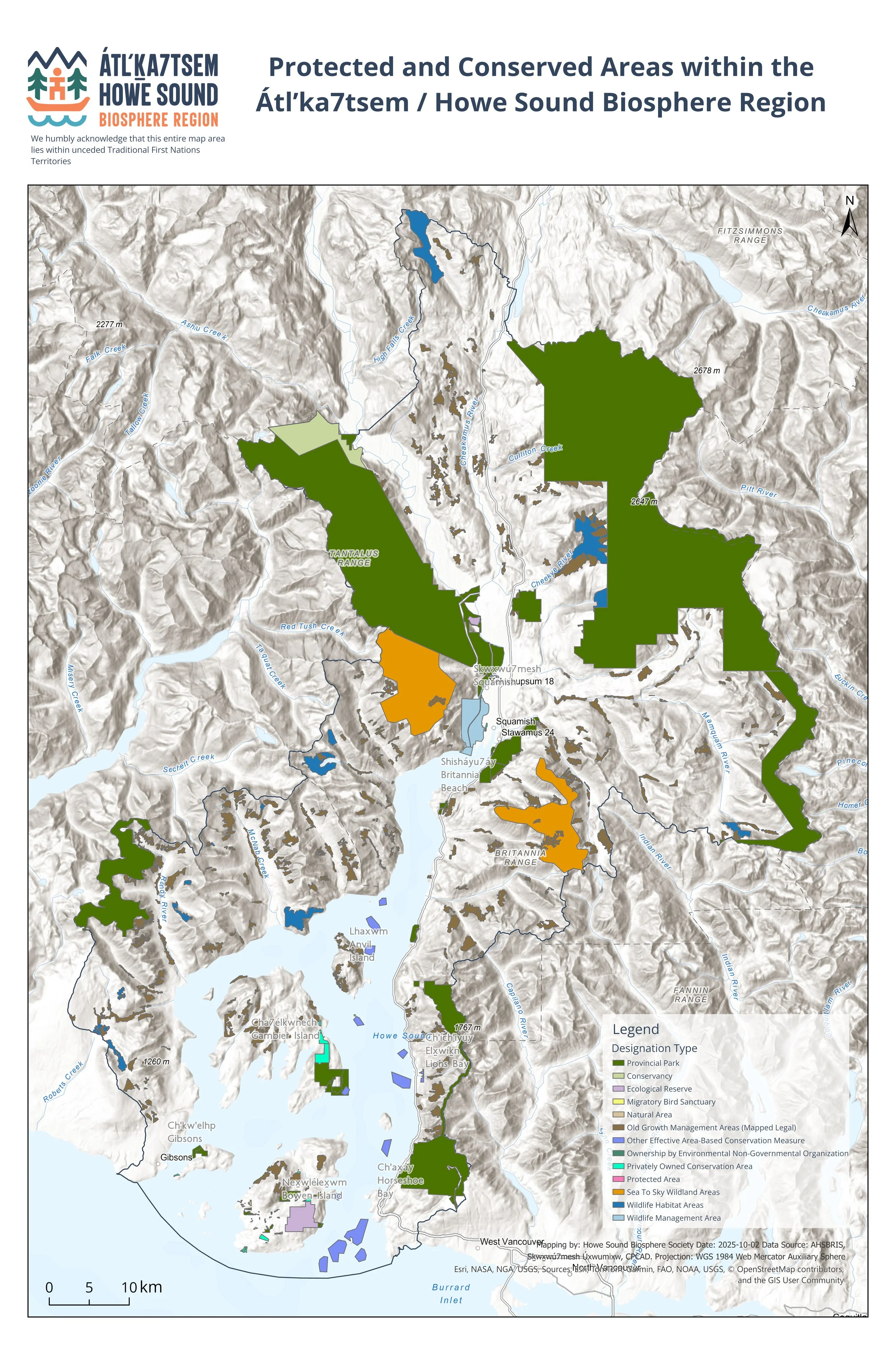 Our team communicates with local governments to gain consent to assess lands for OECM recognition. HSBRIS is collaborating with BC Nature on their Municipal Protected Areas Project. We have analyzed the biosphere region to identify potential OECM sites, revealing numerous eligible areas for OECM recognition. In 2024, BC Nature registered lands in Lions Bay, Bowen Island and Metro Vancouver into the database, bringing the total area on land registered in CPCAD to 33.23% with the area of marine at 3.2%. We anticipate this number to continue to grow with the current conservation initiatives underway by Fisheries and Oceans Canada, and many parcels of land within the District of Squamish that we have submitted.