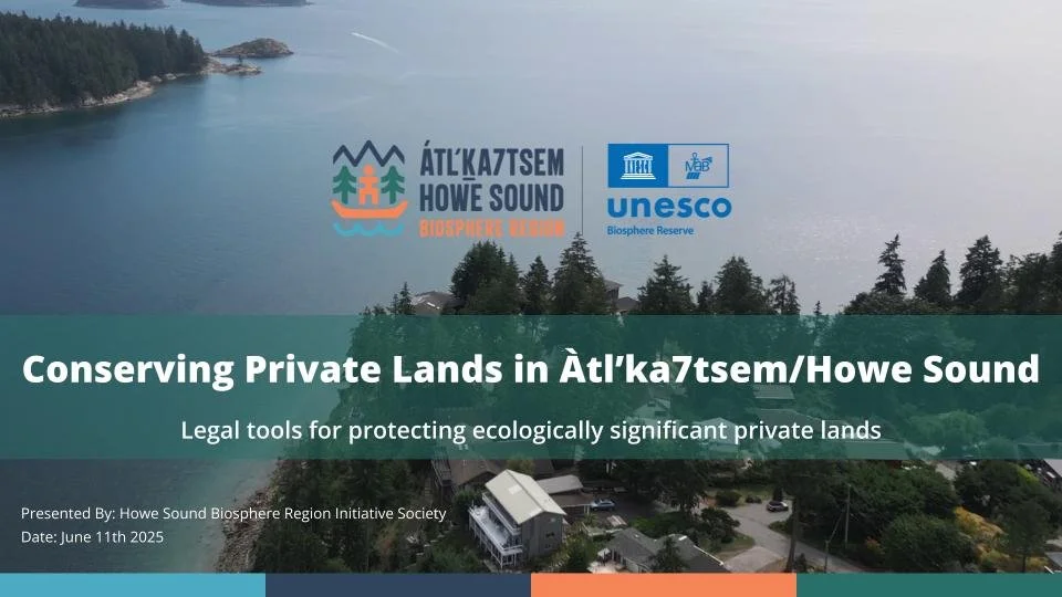 On June 11th, 2025, we hosted a webinar for private landowners to learn about legal tools to protect important ecosystems. The webinar host, Ruth Simons, introduced Samantha Wing, our Projects Manager, who provided an overview of our work that contributes to Canada’s 30X30 Targets. Click here to view the recording. Start the recording at 7:04 minutes to jump to the information about Covenants, and at 27:30 minutes is Owen Plowman’s presentation about the Bowen Island Conservancy’s acquisition and protection of the Roger Curtis lands.